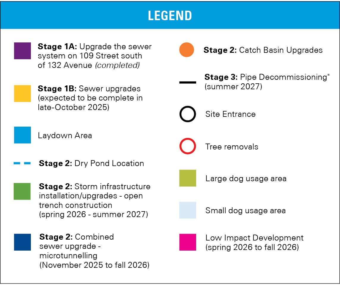 To reduce the flood risk, EPCOR will be constructing a dry pond in the Grand Trunk Off-Leash Dog Park and installing/upgrading various storm infrastructure throughout the Lauderdale neighbourhood.