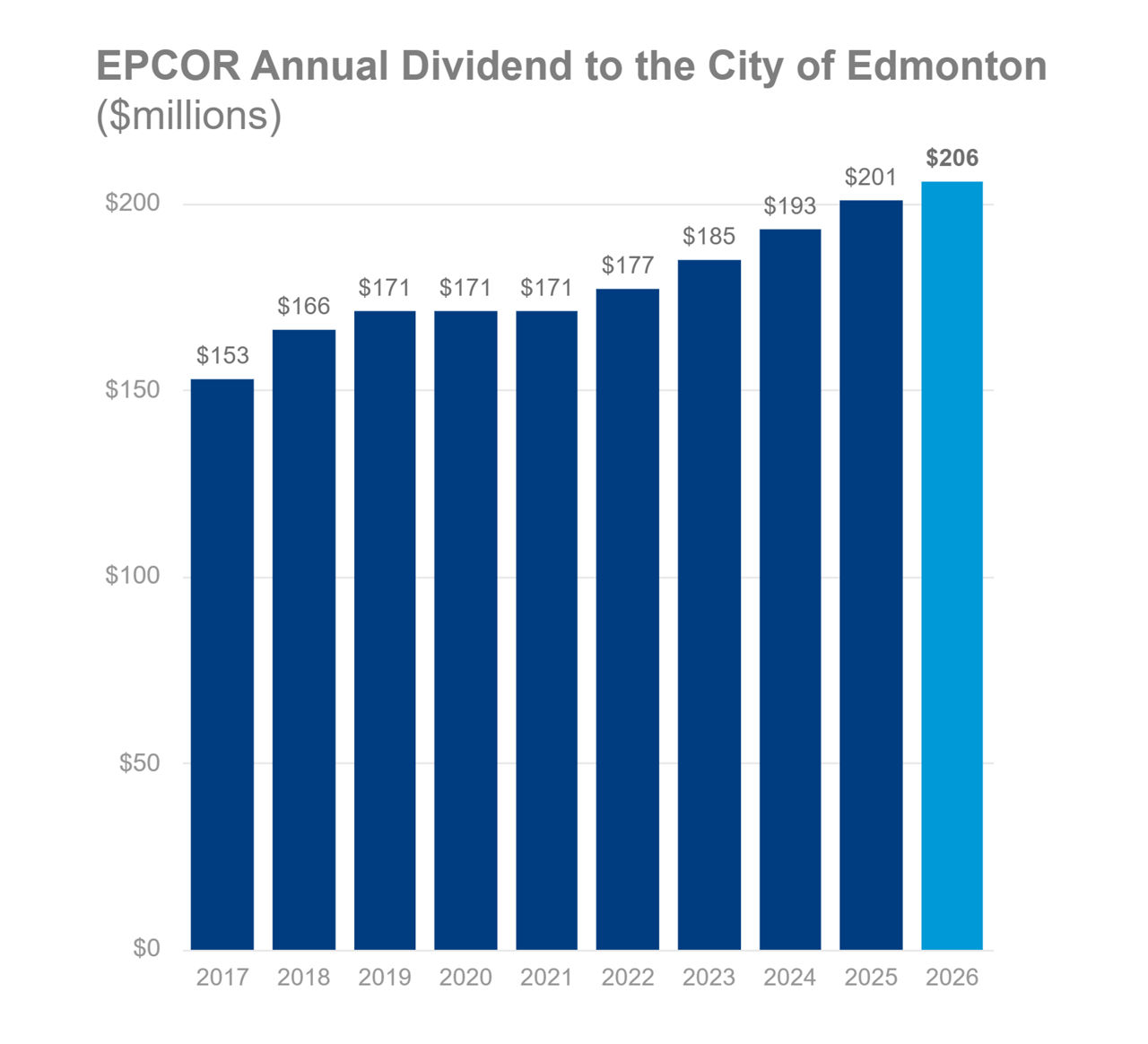 EPCOR's dividend to its sole shareholder, the City of Edmonton, has grown from $62.3 million in 1996 to a forecast $206 million in 2026. From 1996 to 2026, EPCOR’s dividends to the City will have totalled $4.17 billion.